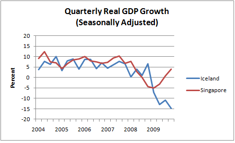 If you haven't guessed yet, surprise! Country A is Iceland, Country B is Singapore. I would love to have some sort of answer to the obvious question: why did Singapore get it so right when Iceland got it so wrong? One answer is "regulation" but that's just restating the question: why did Icelandic regulators fail so miserably while Singaporean ones succeeded? And remember, both countries have (or if you're Iceland, had) really concentrated banking sectors that had all sorts of irregular links to politics worked closely with the political establishment. One answer is that banks in Singapore are all old family businesses, while banks in Iceland were new and naive. Another is that the bankers in Iceland were idiots and the bankers in Singapore are smart. I'm not sure, but I'd like to know.