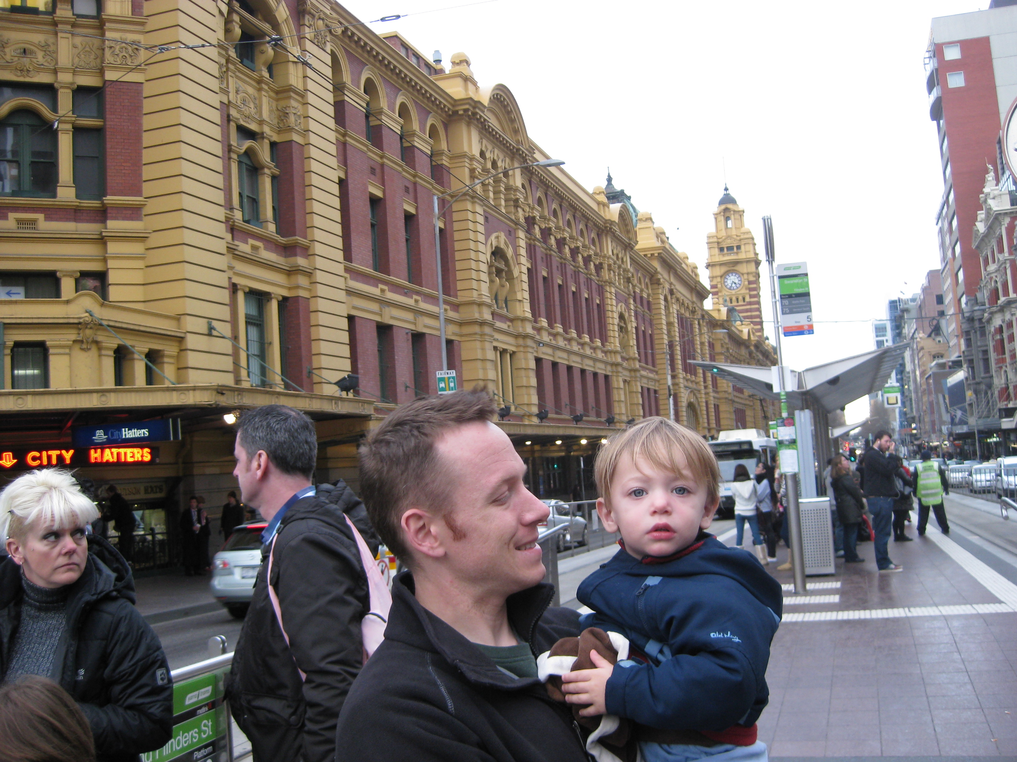 We’re at the end of our time in Melbourne so I thought I’d (JMP) blog about our experience here. As suspected, we’ve decided it is unfair to visit any city soon after Sydney. For us, Sydney is such an unbelievably beautiful place that it’s an impossible act to follow. That being said, we’ve liked our time here a lot although we haven’t explored all that much. We were constrained by our short time here, the rainy weather, and of course traveling with a toddler who doesn’t tend to walk in a linear fashion and is too wiggly to sit in his stroller for long periods of time. We spent our time in the Central Business District and it was fun to be here on a weekday to see the rush hour traffic and see just how many people live here. There is a river and harbor area but the city isn’t really centered around the water like Sydney is. The harbor area reminded us of Auckland and featured a big, new retail center with shops and restaurants for the tourists (and maybe the locals too). The river had a similar spot across from a busy commuter train station with a giant outdoor TV and some shops and restaurants and some cool modern architecture. The few older buildings we saw were juxtaposed against this newer area and it made for a pleasing contrast.