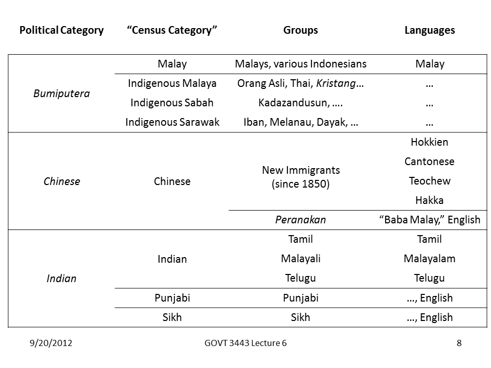 This slide is one of my favorites. It shows some examples of the great variation out there in the types of people who count as Malay, and gives us the legal definition for why that is the case. Given the legal definition of what constitutes a Malay, it is simply not true that race is the proper term to describe the differences between Malays and non-Malays (or bumis and non-bumis; don’t get me started about Kristang). This would be true even if race were a useful analytic category. The fact that the phrase masuk Melayu exists—to become Malay, or more literally, to “enter Malayness”—shows you why “race” doesn’t capture the essence of ethnic or communal issues in Malaysia.