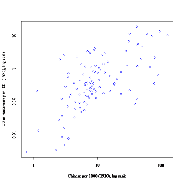 As fascinating as the maps are, it is hard to see from them how Chinese and other foreign Easterner settlement covary, so I have also produced a scatterplot of the two.