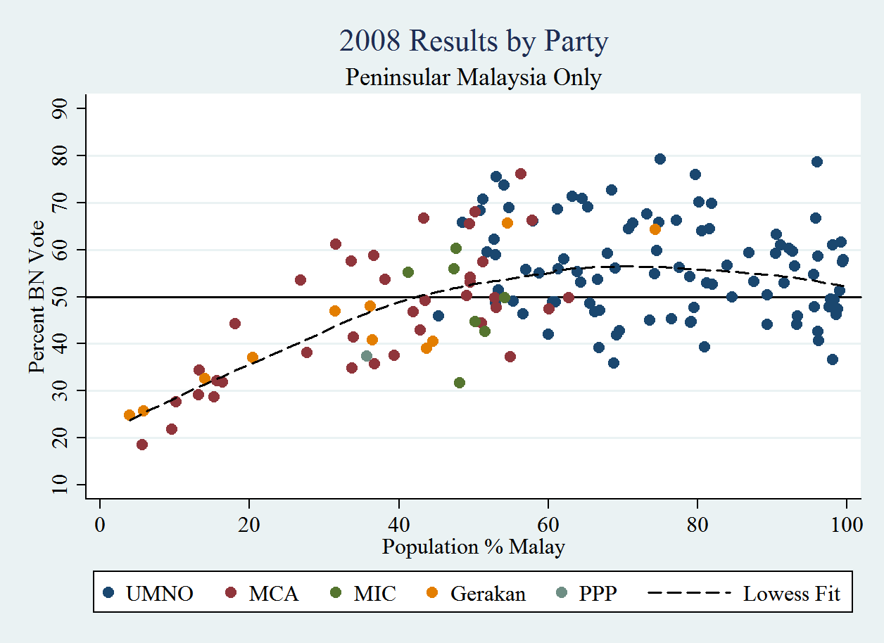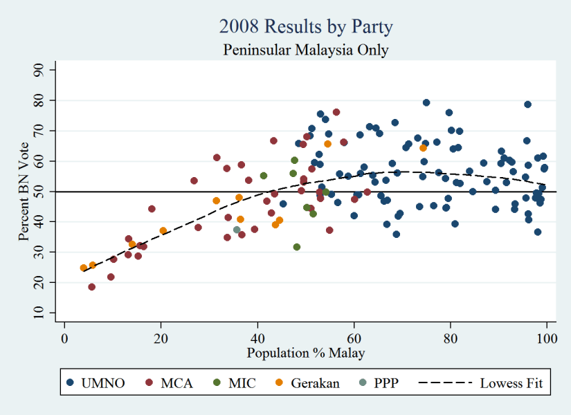 Here is a graph using the data that I made for this article on the 2008 Elections (ungated early version here). It shows the results of the parliamentary elections for each Peninsular electoral district, arrayed against the percent of that district classified as “Malay.” I’ve separated the results by BN party (UMNO, MCA, MIC, Gerakan, and PPP), and only included head-to-head races (only dropping a couple).