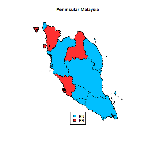 In previous posts my focus has been on Dewan Rakyat elections, but state level results will matter too. Here is a map of the peninsular states held by the Barisan Nasional (blue) and Pakatan Rakyat (red). Of course, the official opposition coalition only formed after the election.