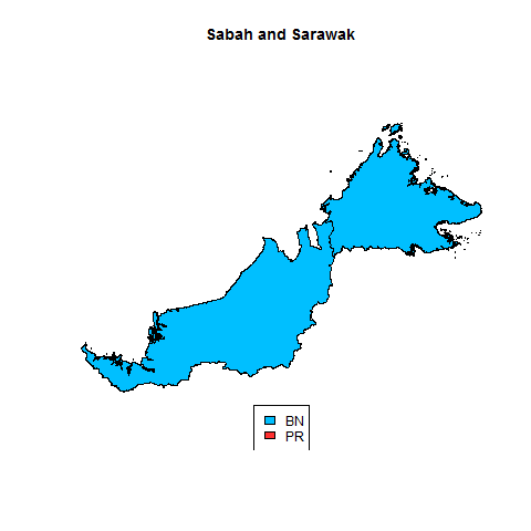 One of the blue states, Perak, was red after the 2008 election, but several PR reps jumped to the BN. Here is a map for the two East Malaysian states.