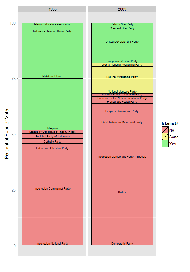 My post on Islamism and Elections in Southeast Asia got some nice feedback, and I’m convinced that the simple graphics helped. I was surprised, though, at the amount of offline feedback that I got about (1) the fact that I chose pie charts and (2) that I did them in Excel.
