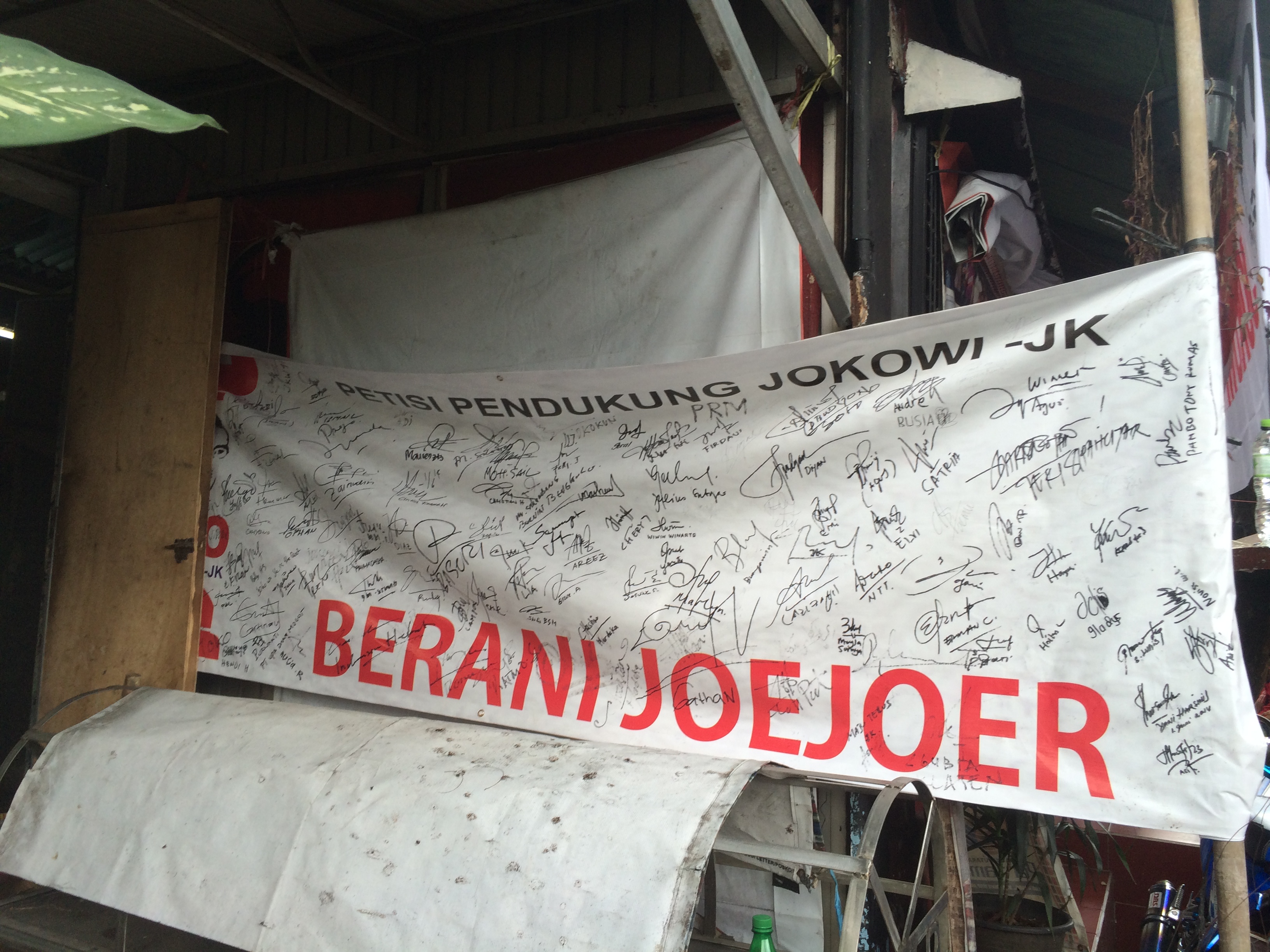 They’ve gone with Pilih yang bersih, jujur, tegas [= choose the ones who are clean, honest, and resolute]. This is interesting because jujur (honest) is one term almost always associated with Jokowi. Indeed, right across the street, we have a Petisi pendukung Jokowi-JK [= Petition of Jokowi-JK supporters]