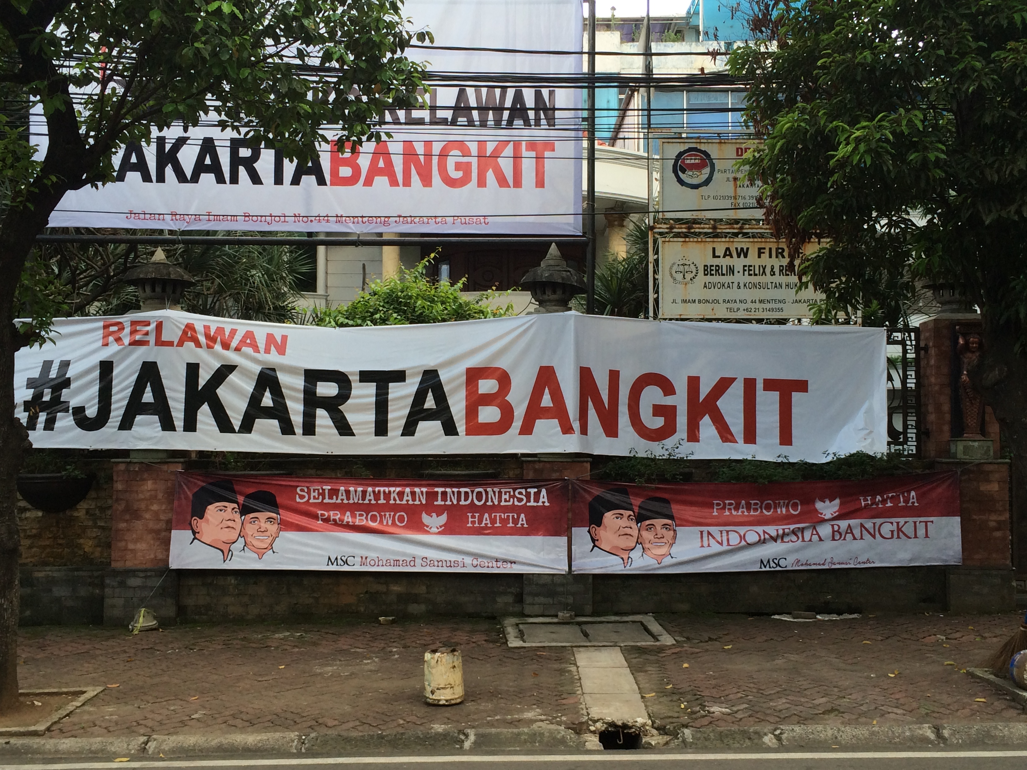So there we have it. Over the course of about half a mile along one of Jakarta’s most prosperous downtown streets, a wealth of imagery conveying the tone of each campaign. It’s no substitute at all for the kinds of deep analysis that Aspinall and Herriman provide, and it doesn’t at all answer my question about why such messages generate support for Prabowo, but it does give a very basic sense of what’s going on.