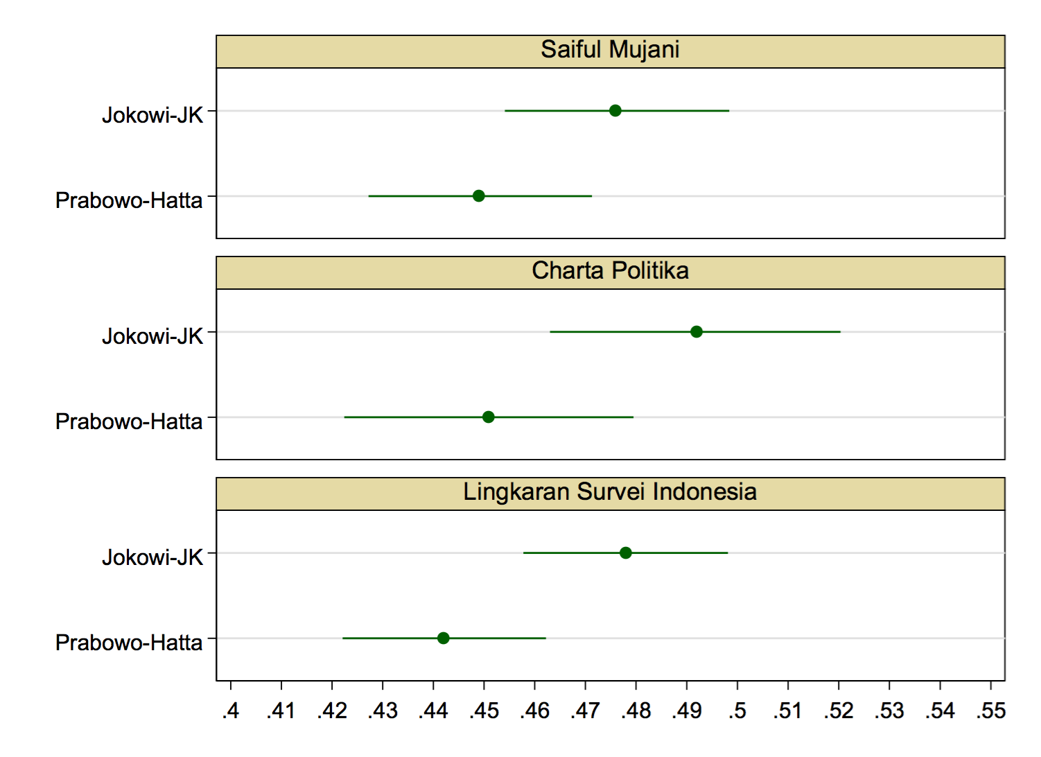 The latest polls have Jokowi-JK narrowly ahead. Here are the latest polls by Saiful Mujani Research and Consulting, Charta Politika, and Lingkaran Survei Indonesia, with estimates and 95% confidence intervals plotted (see here how we get the confidence intervals).