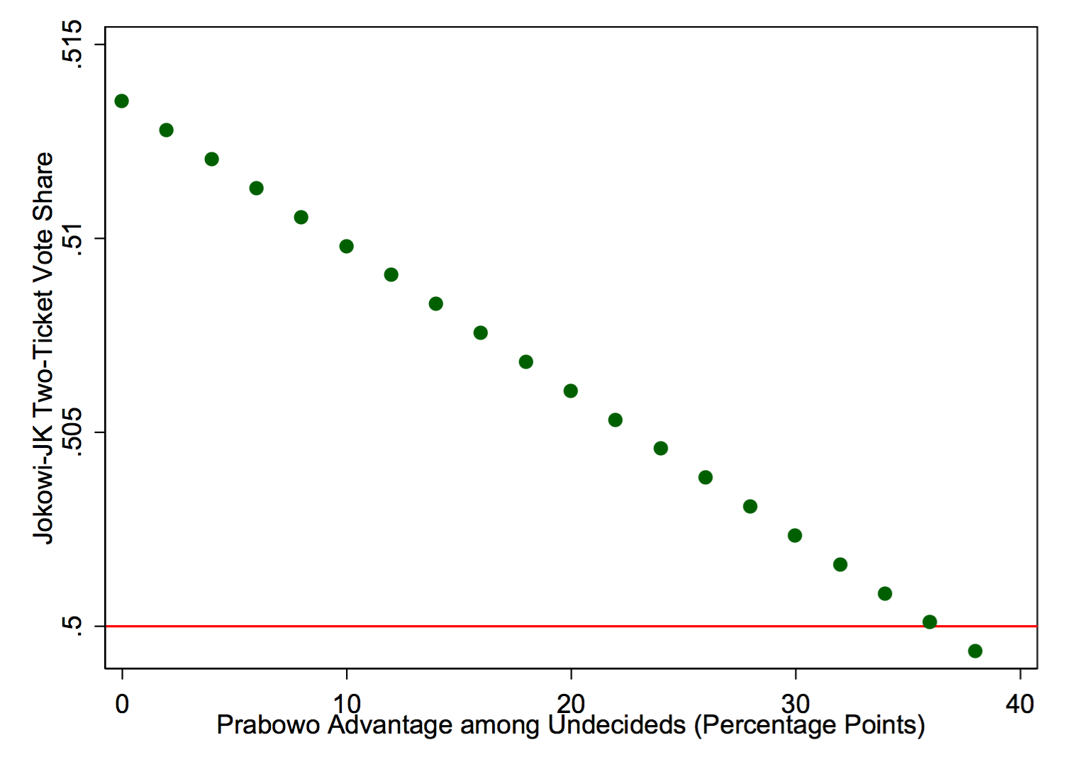 Now let’s say that 60% of undecideds go for Prabowo—a 20 percentage point advantage for Prabowo. That leaves 1011 respondents for Jokowi and 986 for Prabowo, with our best guess still that Jokowi wins, but with a lower two-ticket vote share of only 50.6% (and accordingly more overlap in the CIs). We can keep going, adding more of an advantage for Prabowo. As it turns out, it takes about a 36 percentage point advantage for Prabowo among the undecideds (68% go for him) to equalize his chances, as the graph below illustrates.