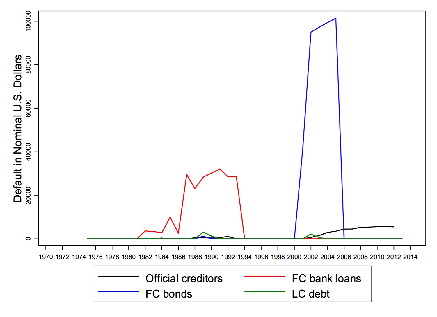 The 1980s and early 2000s debt crises are readily apparent here, as are the differences between the two. The data also help to remind us that unlike personal bankruptcy, defaults endure. We also see original sin in action: Argentinian defaults do not involve LC (local currency) debt because Argentina/Argentinians cannot borrow abroad in their local currencies.