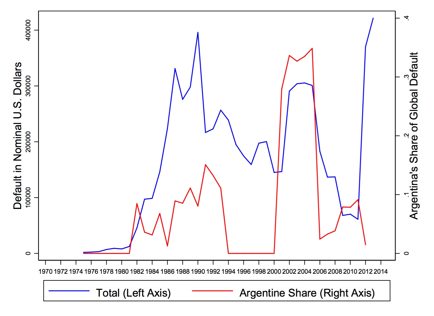 What’s interesting to me is the share of Argentine debt in default as a ratio of the total amount of debt in default globally. We can look at this too: