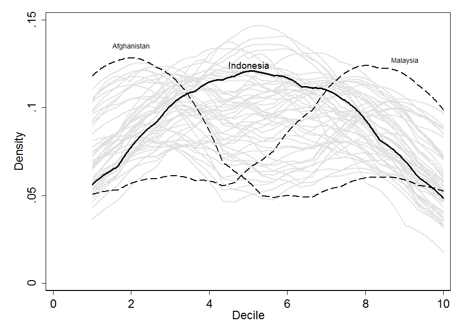 Here is what this looks like. Each gray line represents a kernel density plot for one country’s decile scores. Indonesia’s is the thick black line.
