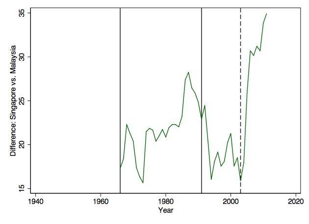 The black lines are Lee Kuan Yew’s term as Prime Minister in Singapore. The dashed line in Malaysia? That’s when Mahathir Mohamad retired.