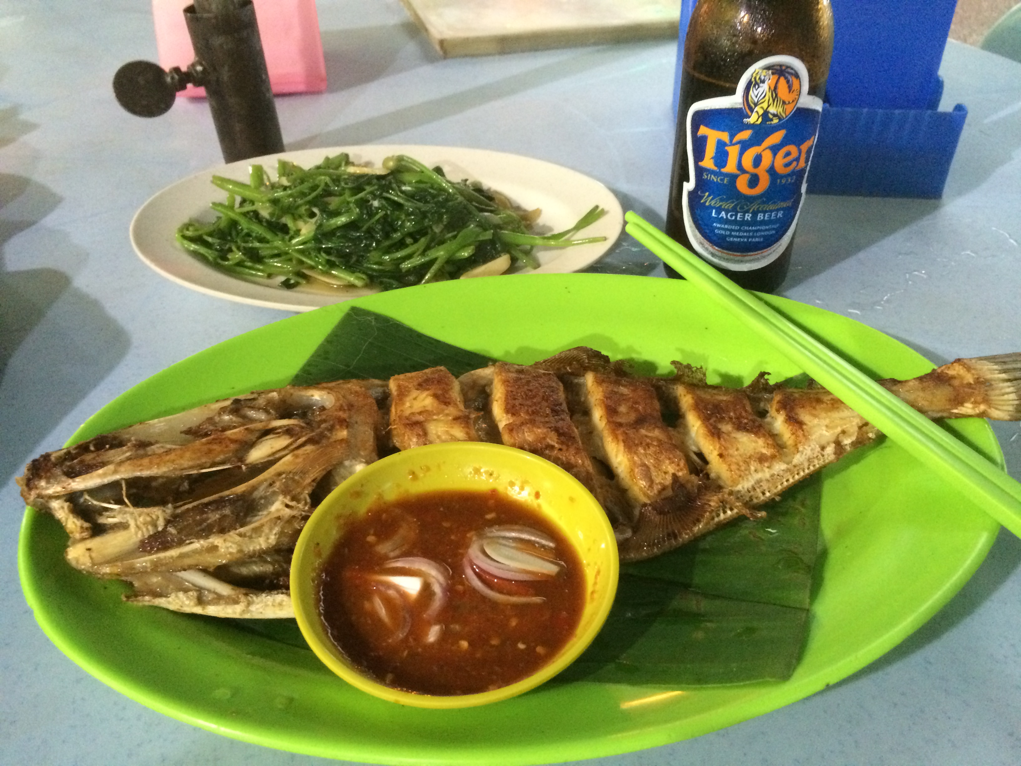 And now for the meal: a portion of grilled “chicken fish” (no one knows what this is), plus kangkong with garlic. And a local beverage cool down.