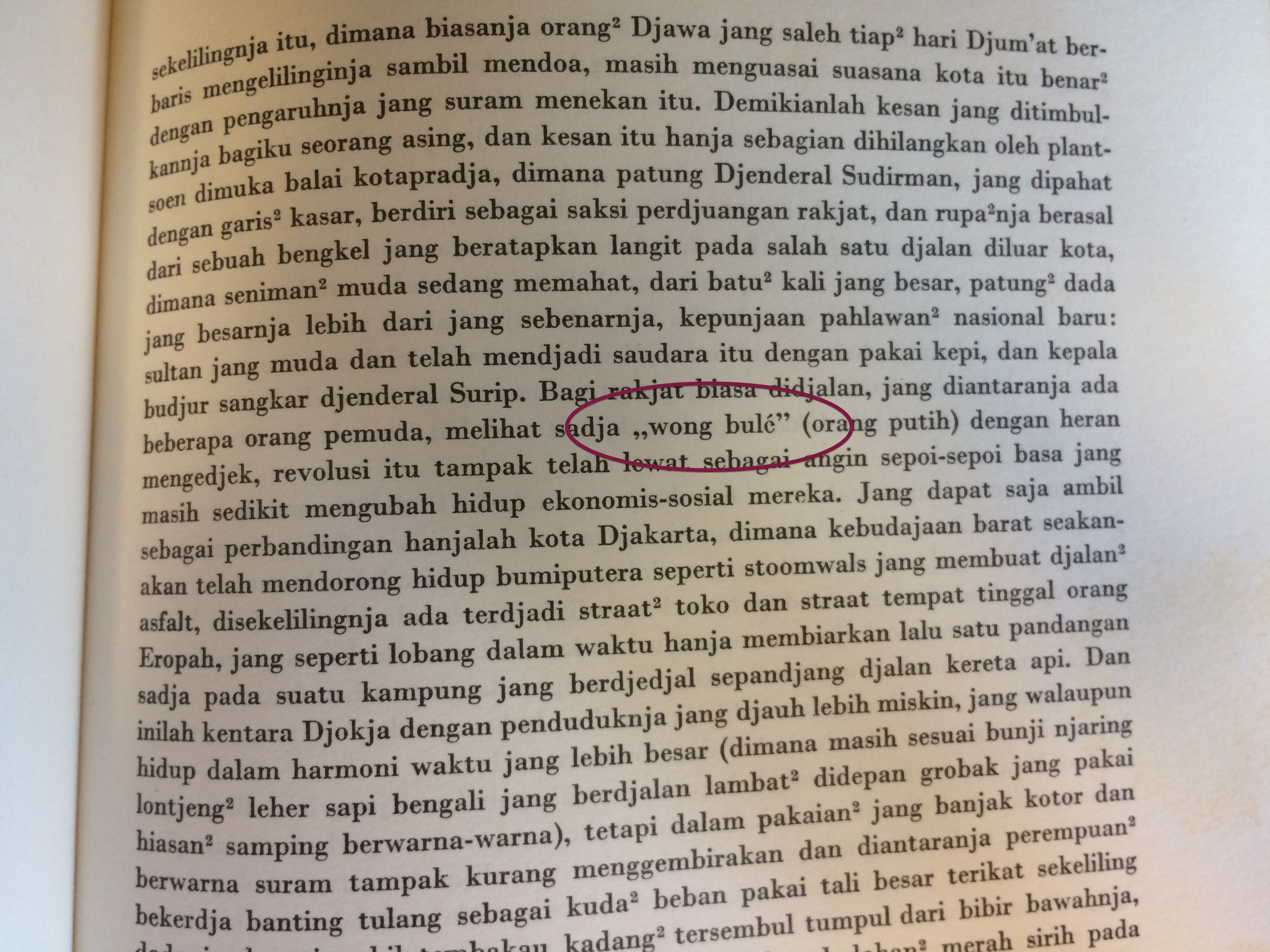 An interesting footnote to this find is the context of the quote: it is describing the sentiments of youth during the time of the Indonesian national revolution, seeing wong bule as confused and unsettled by the social upheaval at the time. That community and that time period is exactly the subject of Anderson’s Java in a Time of Revolution. A nice parallel, reinforcing the power of language in a time of revolutionary ferment.