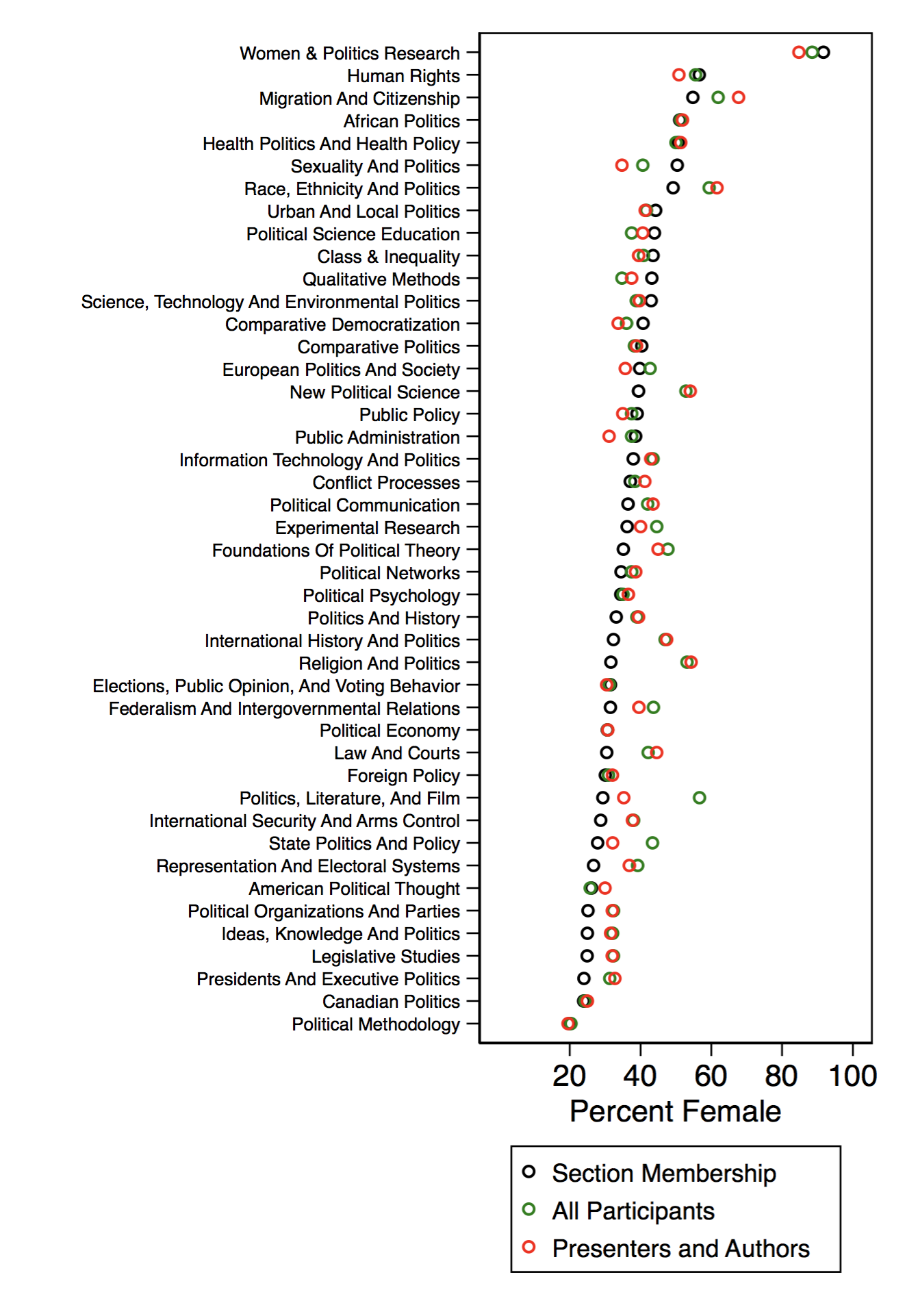 The black dots correspond to Montgomery’s data on the percentage of each section’s membership that is female. The green dots, by contrast, are the percentage of each section’s total panel participants (all chairs, discussants, presenters, and authors) that are female. Because many people argue that the roles of “chair” and “discussant” allow for only token participation, the red dots are the percentage of each section’s authors and presenters only that are female.