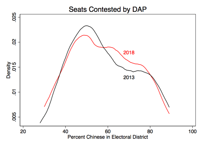 In 2013, PAS contested primarily in Malay-majority districts. This is still true, but it has taken the fight to mixed Malay/non-Malay districts as well in ways that it never had before. Compare this with seats contested by DAP, a PH party with a largely Chinese constituency.