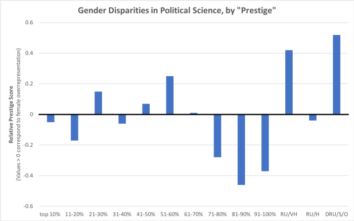The other piece of information that might be of interest is their estimate of the field-specific measure of prestige segregation in political science (which corresponds to Φ in Equation 3 in this article). The value for political science is .31, which is relatively low compared to most hard sciences and also many humanities fields like Comparative Literature, German, and Religion, in which men are much more overrepresented in the highest ranked programs. For results that are more easily interpretable to compare gendered prestige segregation across fields, you can look at the Panel B on Table S3 here (PDF).