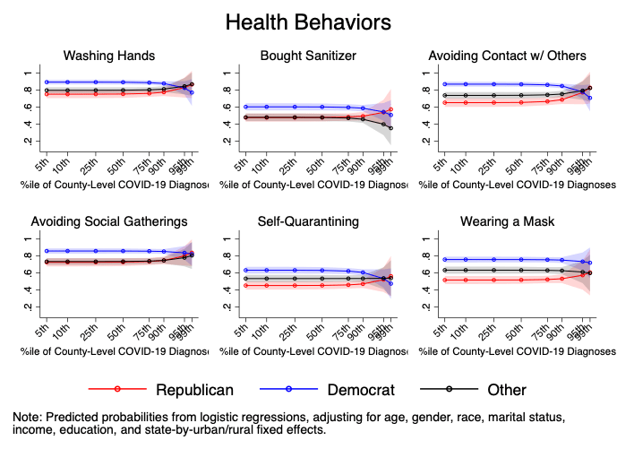 To check if this is plausible, we investigate below six health behaviors where we observed strong partisan difference in late April/early May: wearing a mask, self-quarantining, avoiding gatherings or contact with others, washing hands, and purchasing hand sanitizer. We use logistic regression to estimate the probability that someone reports doing each of those things, controlling for basic demographic facts as well as a demanding set of state-by-urban/rural fixed effects. This means that we are comparing, in essence, people at the same level of urban versus rural in the same state, so we don’t assume that the effect of being in a rural area is the same in, say, New York versus Wyoming.* Importantly, we also allow the effect of partisanship to vary by the county-level COVID-19 diagnosis rate as of May 1 (right near the end of our survey). And we find this: