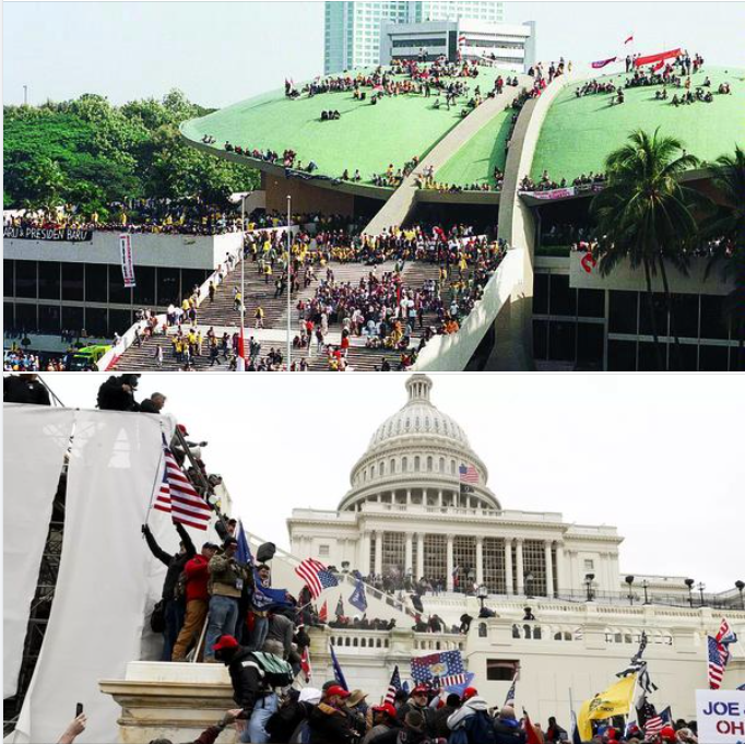 An Indonesian friend shared this on Facebook last night: a comparison of the 1998 students’ occupation of the People’s Consultative Assembly (top), and the 2021 Capitol riot (bottom).