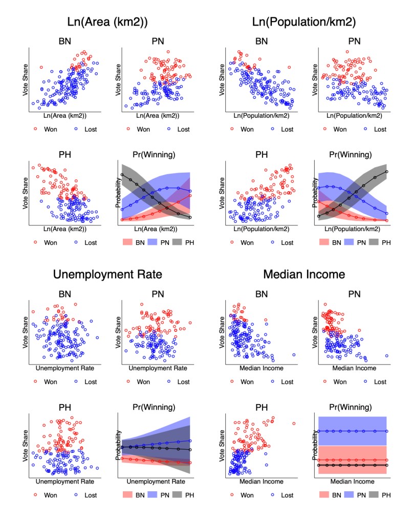 The summary message from this graph is pretty simple. There is indeed a strong correlation between constituency size and constituency population density—each a reasonable measure of urbanization—and coalition vote shares. PN did better in rural constituencies with low population densities, and PH did better in urban constituencies with high population densities. Looking at income and unemployment, though, we find no relationship whatsoever.