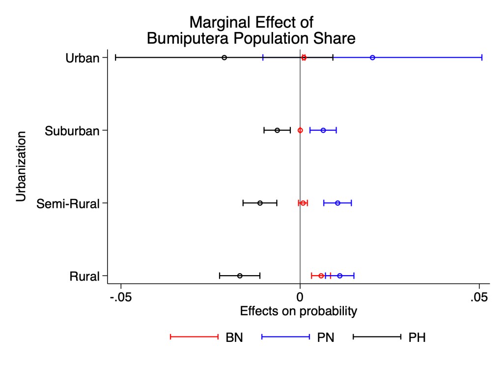 In rural and semi-rural districts, PN’s likelihood of victory is positively related to bumiputera population share, and reverse for PH’s likelihood of victory: PH is less likely to win the higher the bumiputera population share. This is the same as what I found above. But if you look at urban districts, you find no relationship between ethnic structure and the probability of victory for any party: confidence intervals are very large and we cannot reject the null hypothesis of no relationship.