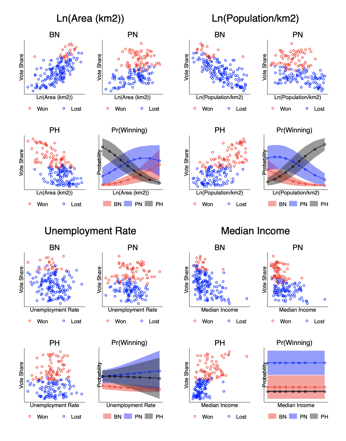 The summary message from this graph is pretty simple. There is indeed a strong correlation between constituency size and constituency population density—each a reasonable measure of urbanization—and coalition vote shares. PN did better in rural constituencies with low population densities, and PH did better in urban constituencies with high population densities. Looking at income and unemployment, though, we find no relationship whatsoever.
