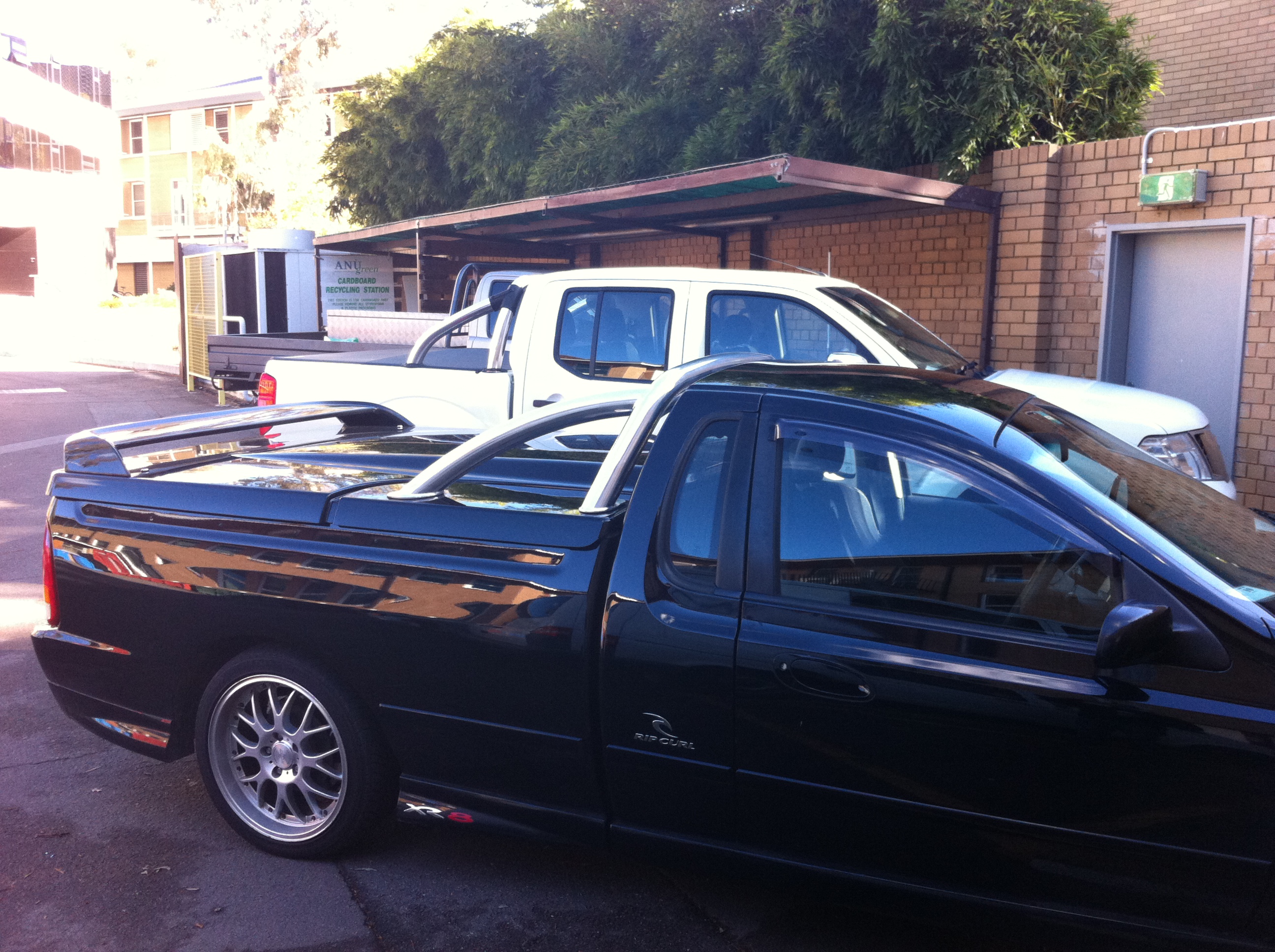 This car was parked next to my office today. A shiny new jet black Ford Falcon Ute. Check it out. Spoiler? Check. Roll-bar? Check. Official Ripcurl detailing? Check. Bed cover? Check. 15 inch rims? Check. This vehicle says, “you know, I don’t need a second row of seats, but I’m not looking for anything too useful for real work.”
