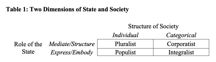 Recent scholarship on democratic backsliding has focused on measuring its global prevalence and identifying the causal processes and mechanisms that produce or inhibit backsliding around the world. But many of the political dynamics that motivate both scholarly and popular concern about the state of democracy are about the desired model of society and the proper role of the state rather than about electoral democracy. This manuscript examines pluralist, populist, corporatist, and integralist models of state-society relations, conceptualizing them with reference to normative models of the modern state and beliefs about the nature of society, and using them to identify distinct varieties of democratic backsliding and axes of conflict within backsliders. Treating conflict over the social ontology of the modern state as “democratic backsliding” obscures a deeper politics of state-society relations, and how those politics independently shape regime contestation in contemporary electoral regimes.