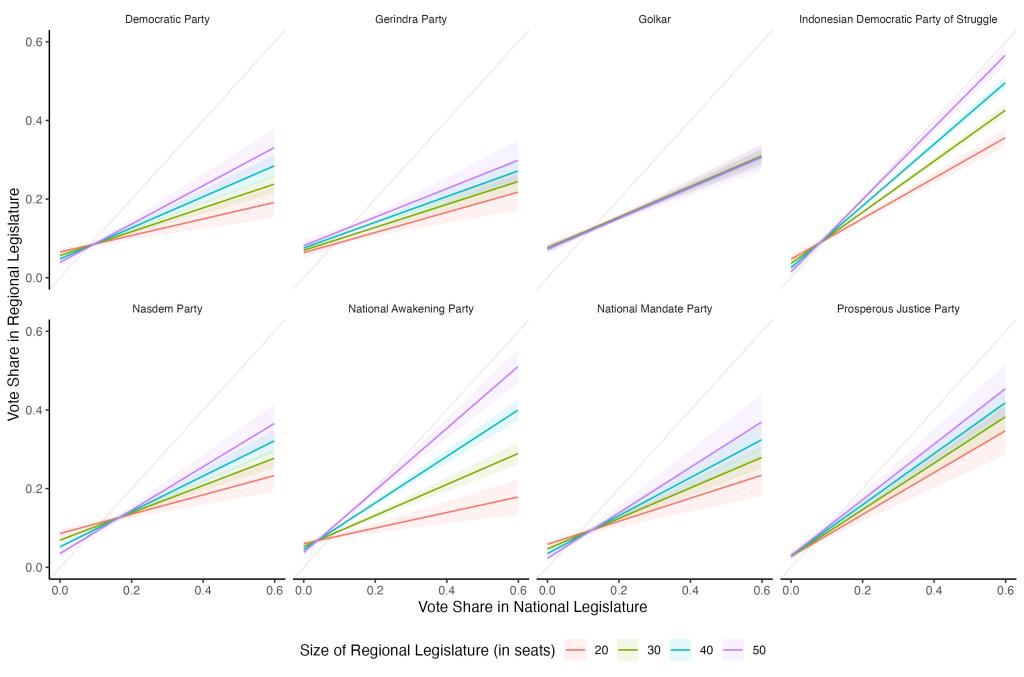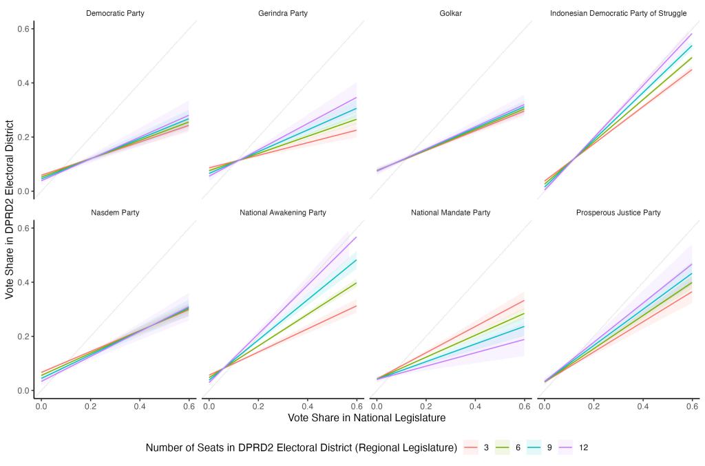 As expected, the strength of the relationship between DPR and DPRD-II results varies by party. It also varies by district magnitude in ways that are entirely consistent with expectations: the bigger the district legislature in terms of seats, the stronger the correlation between party results in national and district legislatures. But the central point here is, partisanship in one election predicts partisanship in another. It does not look like candidate-level factors like money or personality, or regional levels factors like economic development, overwhelm the effects of partisanship on election behavior. We can’t learn why partisanship matters just from looking at this graph, but across parties—and especially for parties with distinct brands like the Indonesian Democratic Party of Struggle (nationalist), the National Awakening Party (Javanese Islam), and the Prosperous Justice Party (modernist Islam)—we see the voters are voting the same ways across elections.
