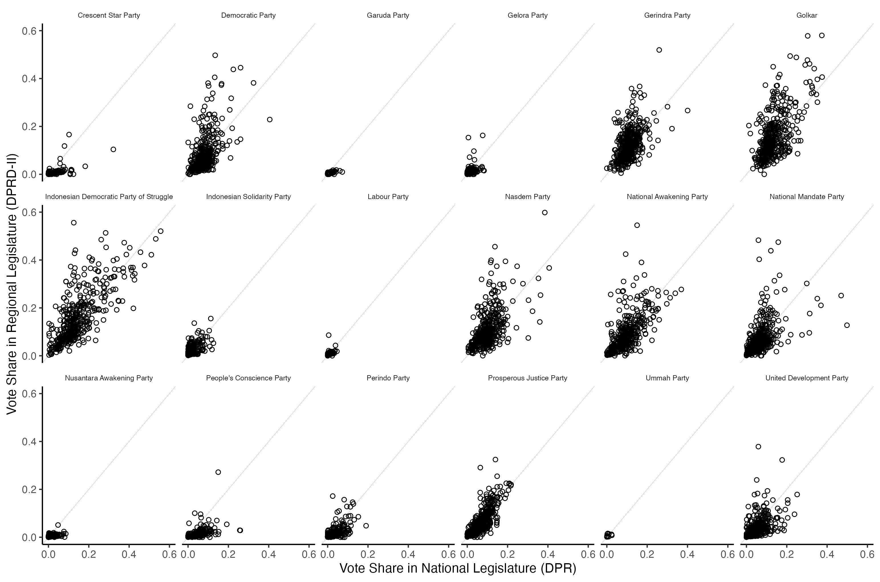 You can see a faint gray line at a 45-degree angle. That represents a hypothetical perfect relationship between votes for each party in the DPR and DPRD-II. It is clear that there is a lot of variation out there in how parties fare across elections, especially among big parties. But you can also clearly see that the two variables are positively correlated. The same parties that do well in the national DPR elections tend to do well in the district DPRD-II elections.