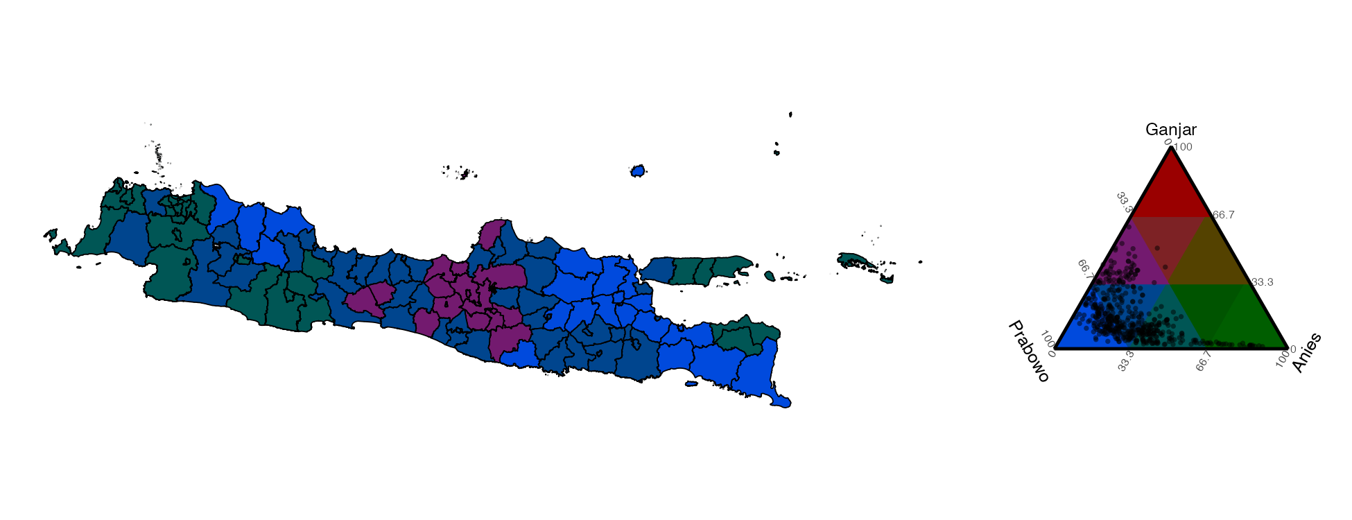 I like to make maps of Indonesian election results. These are easiest when there are only two candidates, because strong results for one entail weak results for others. It is harder to plot with three candidates! But it can be done: below is a ternary plot created using the tricolore package in R.*