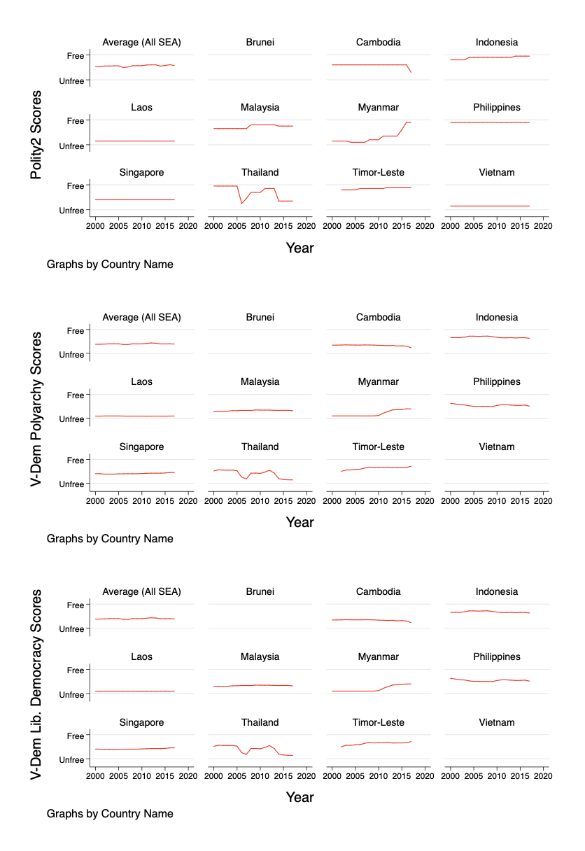 The main differences are that in all three of these alternative indices, Cambodia’s rating declines over the past couple of years. There is also a very small downturn in both Indonesia and the Philippines in the V-Dem ratings, but it is small enough that it is hard to see.
