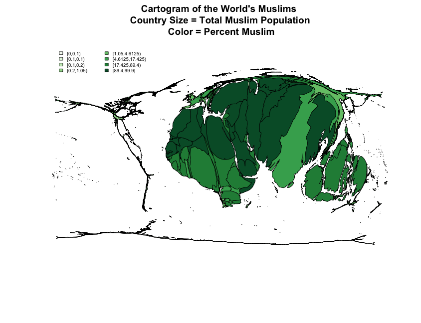 This cartogram—created using ScapeToad and MapTools in R, using data from the Pew report on The Future of the Global Muslim Population—helps to visualize just how important Asian Islam should be in conversations about Global Islam.