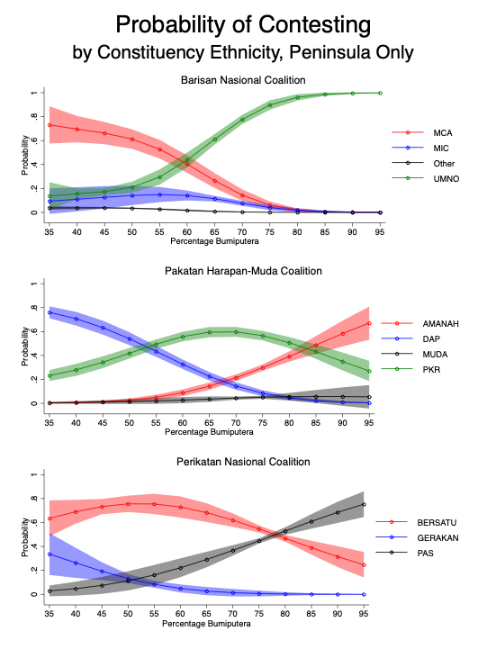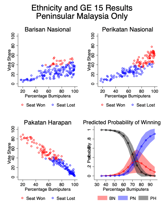* These results come from a simple multinomial logistic regression where the outcome is the winning coalition, and bumiputera population share is the sole predictor. More sophisticated analyses with many more predictors produce the same qualitative results.