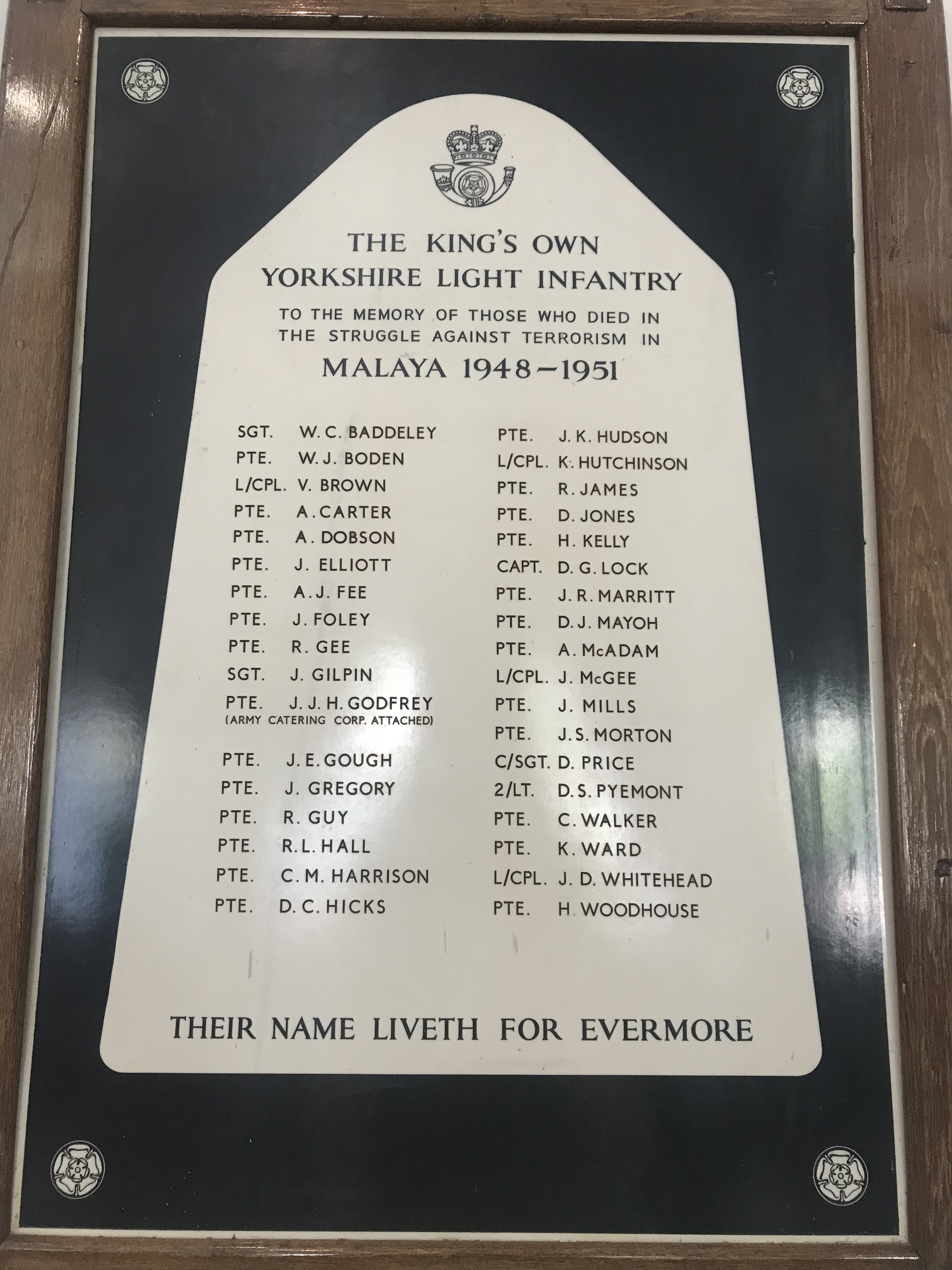 But much more interesting than that are the fascinating little bits of history in the church, each of which ought to please anyone interested in the region’s political history, WWII, the Cold War, and so forth. Two are worth noting. The first is a memorial to British soldiers killed during the Malayan Emergency.