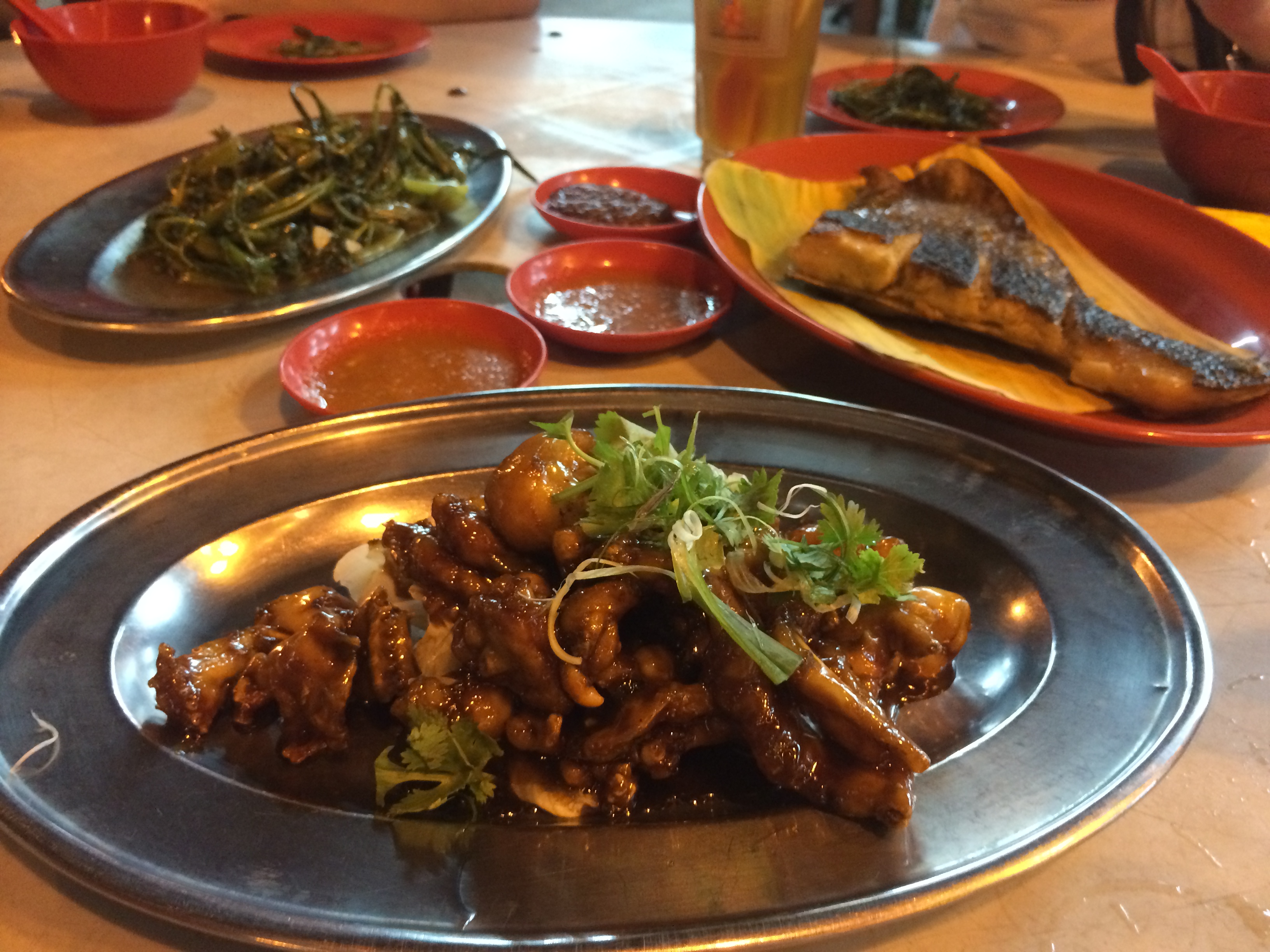 In the back, fried kangkong with garlic and grilled stingray. In the front, Marmite Frogs Legs. Yes, you read that right—colonialism for the win!—and they were delicious.