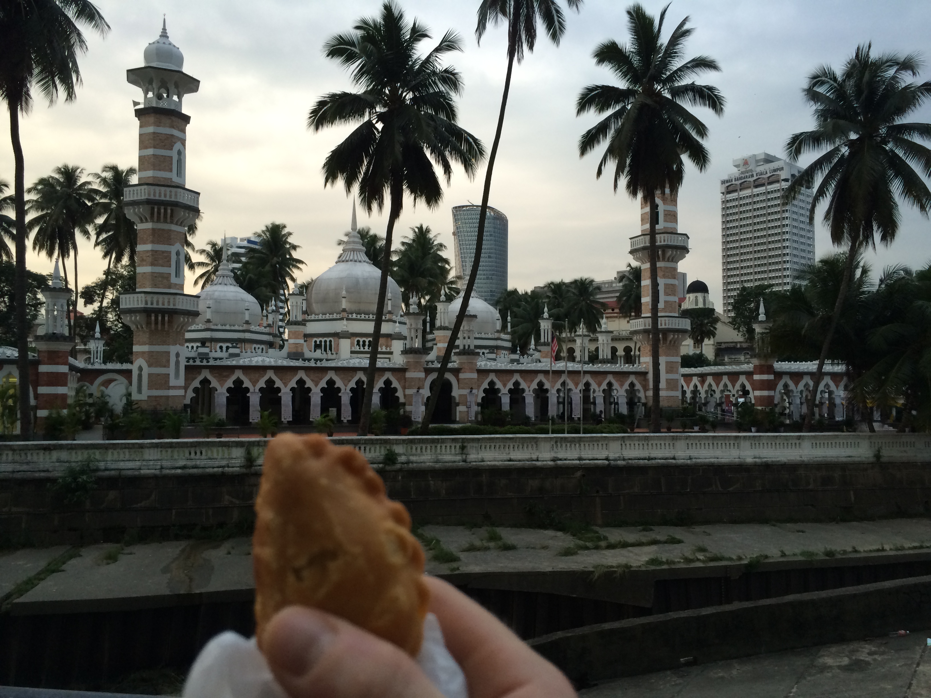 A morning bite: karipap from a hawker, enjoyed at sunrise looking over Mesjid Jamek.