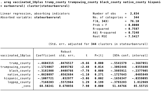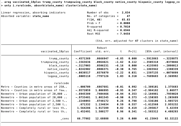 A fuller and more complete analysis of the political and social correlates of vaccination rates will have to wait for another time. But I have placed all of these data and replication commands online to allow anyone to recreate these analyses, update the data with new or more complete vaccination figures, and add new variables (partisanship of the governor! county-level measures of poverty!) that might further refine these preliminary findings.